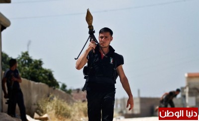 مقاتل من الجيش السوري الحر يحمل قاذفة آر بي جي خلال اشتباكات مع القوات السورية قرب إدلب، سوريا